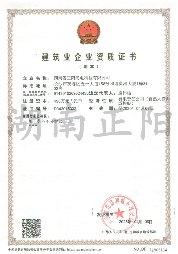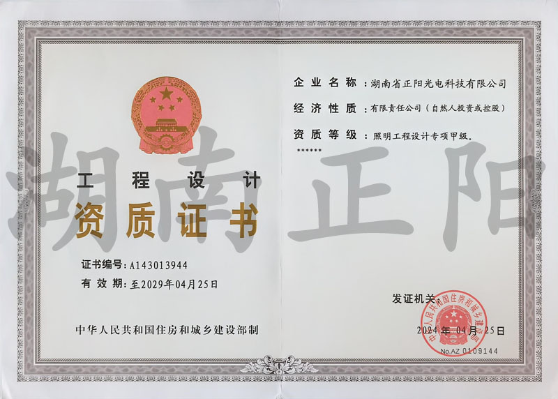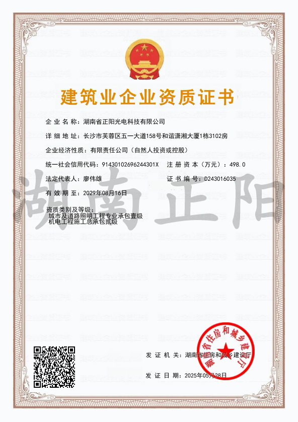 湖南省正陽光電科技有限公司是一家從事亮化工程及大型燈光藝術(shù)的設(shè)計、制作、安裝和維護(hù)于一體的專業(yè)化公司。公司資質(zhì)齊全、管理嚴(yán)謹(jǐn)、技術(shù)先進(jìn)、實(shí)力雄厚,取得了城市及道路照明工程專業(yè)承包壹級資質(zhì)、照明工程設(shè)計專項甲級資質(zhì)、機(jī)電工程施工總承包貳級資質(zhì)、施工勞務(wù)等資質(zhì)、國家高新技術(shù)企業(yè)、國家“重質(zhì)量·守誠信”示范企業(yè)。